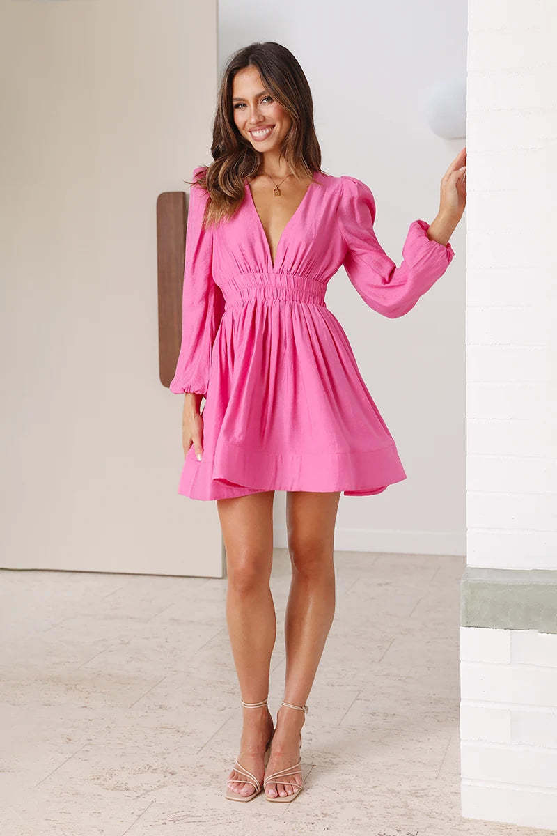 Step out in style with the Sophia Dress in Black. This sophisticated design features long sleeves and a deep V neckline. creating a refined and elegant look. The thick. elasticated waistband accentuates your shape. while the hidden back zip ensures a smooth. seamless fit.