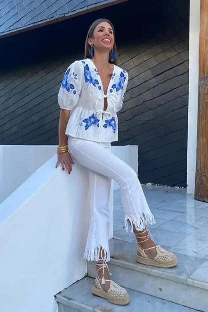 Elevate your wardrobe with our V-neck loose-fit cardigan. This stylish piece features a charming floral pattern and a unique tie closure that adds a touch of elegance. The relaxed fit ensures comfort while maintaining a chic appearance.