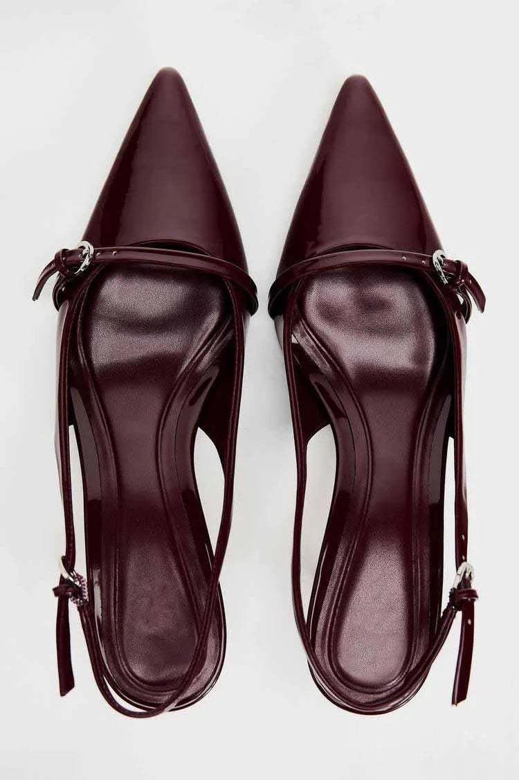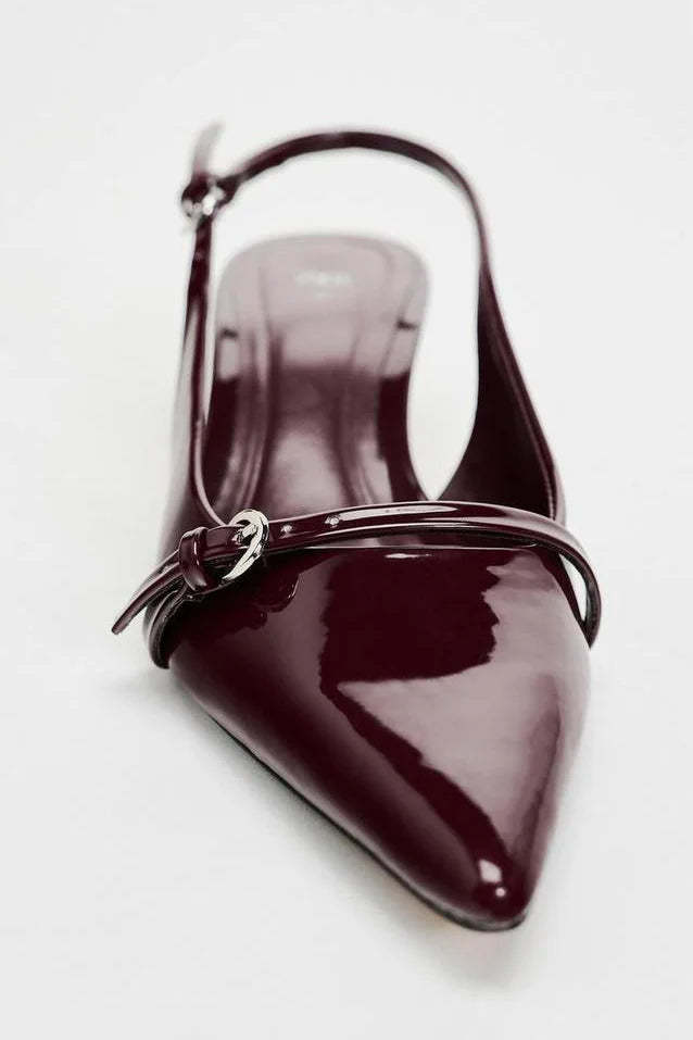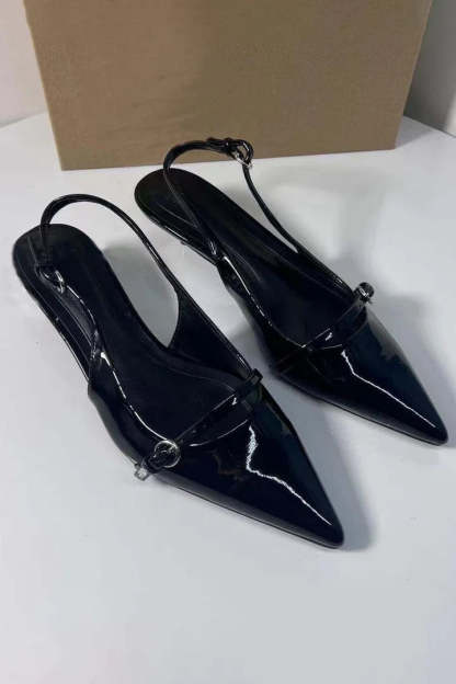 Slingback heels. Buckle detail at front. Pointed toe. Adjustable back strap.