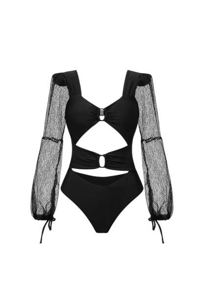 This sleek and sophisticated one-piece swimsuit brings together minimalist design and bold detailing. Crafted in a solid hue with sheer mesh long sleeves. it features strategic cutouts that highlight the waistline and add a modern edge. The body-hugging fabric and sharp silhouette offer both style and structure. making it a standout choice for fashion-forward beachgoers.