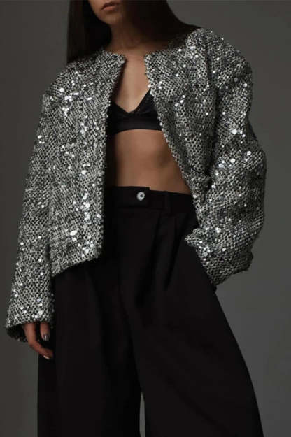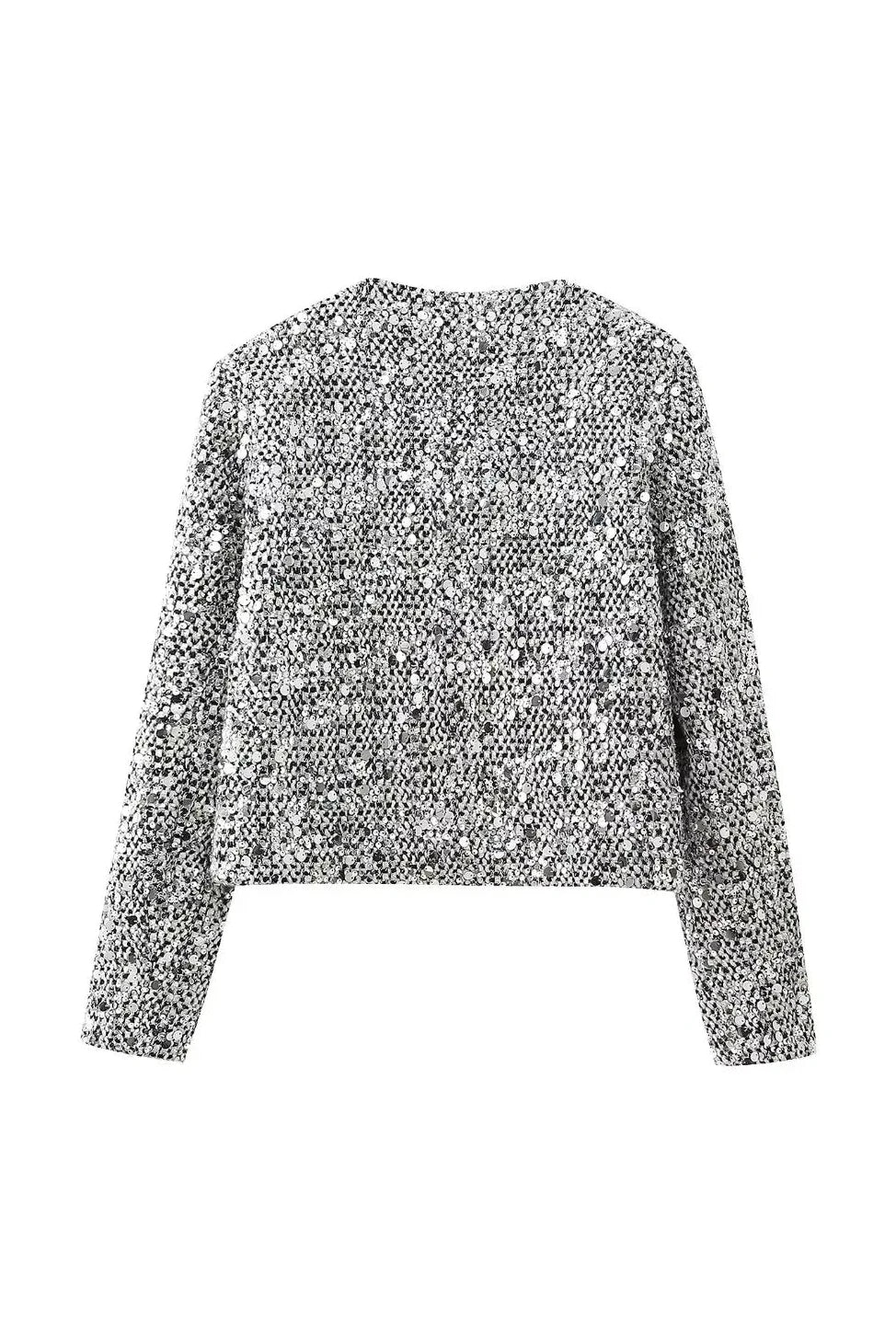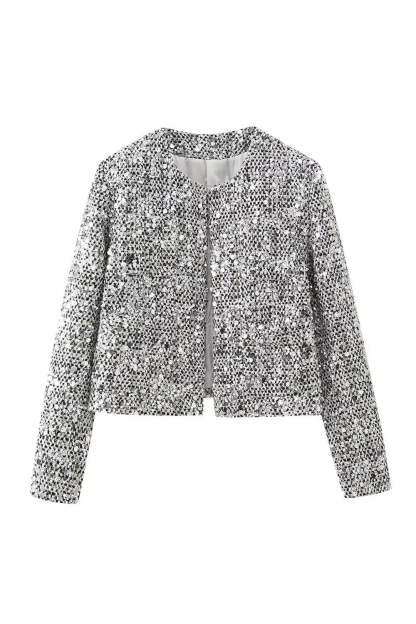 Introducing our New Spring Tweed Sequin Jacket. the perfect blend of elegance and sparkle for the season. Crafted from luxurious tweed with sparkling sequin accents. this jacket offers a refined touch to any outfit.