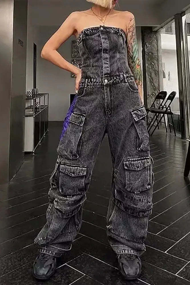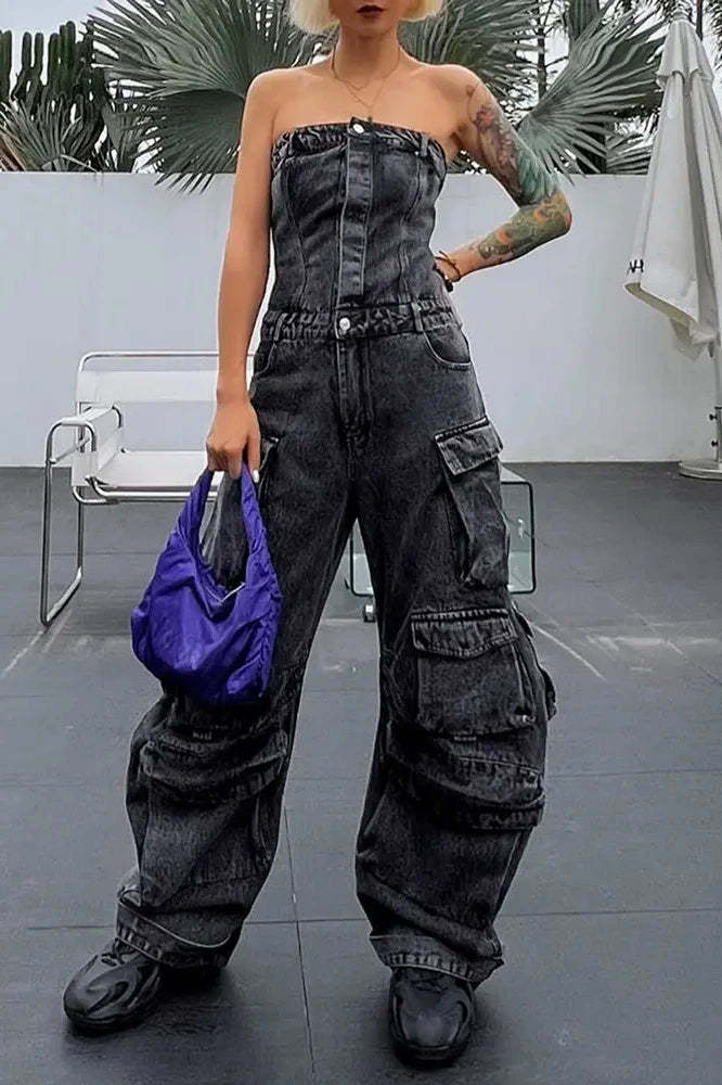 This bold. street-inspired denim jumpsuit blends edgy style with functional design. Featuring a strapless. body-hugging top with a cinched waist. it accentuates your curves while offering a comfortable and flattering fit. The multi-pocket. utility-inspired details add a touch of practicality to the chic look. making it perfect for any fashion-forward individual. Whether you're hitting the streets or attending a casual party. this jumpsuit makes a bold statement.