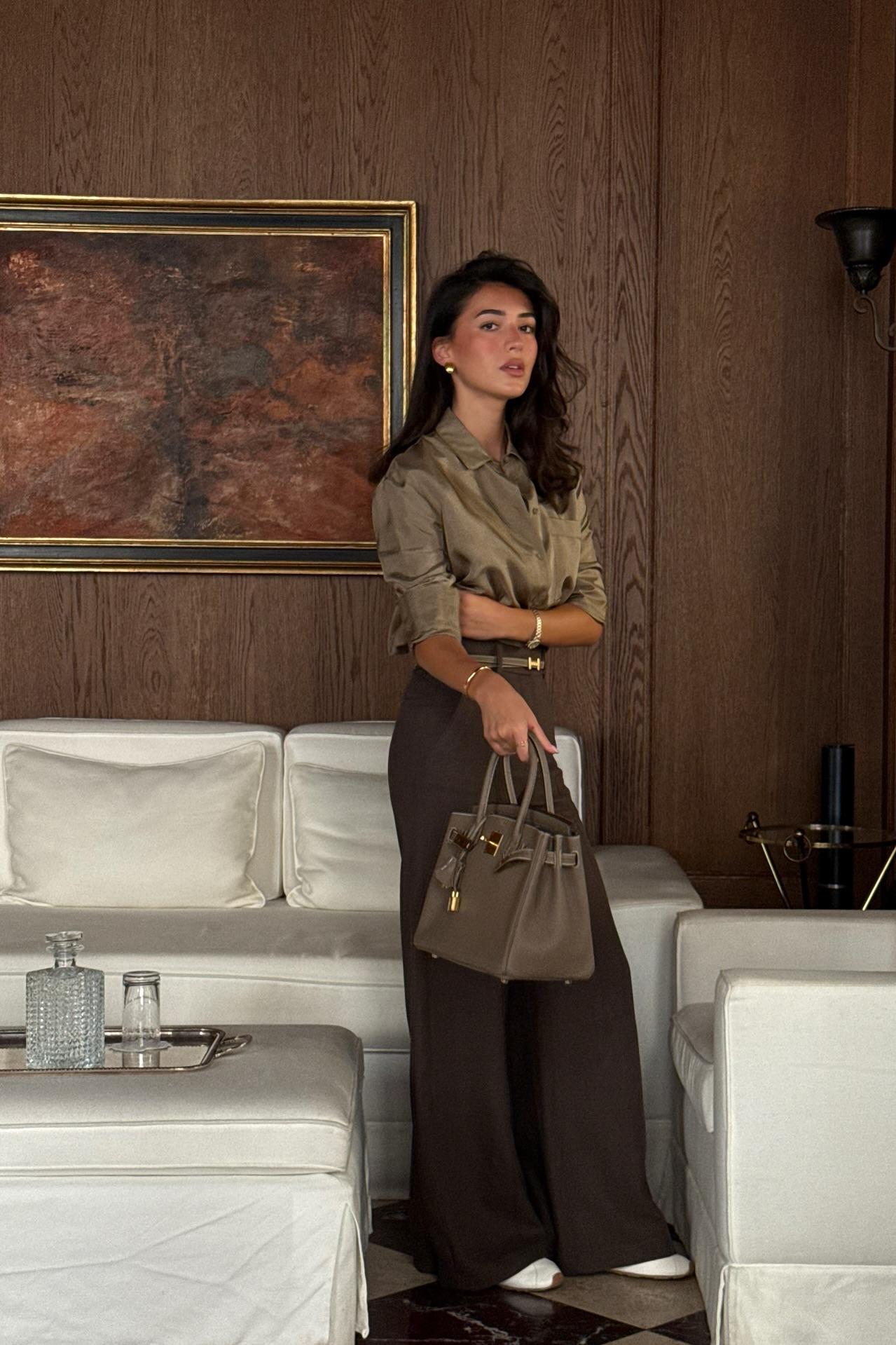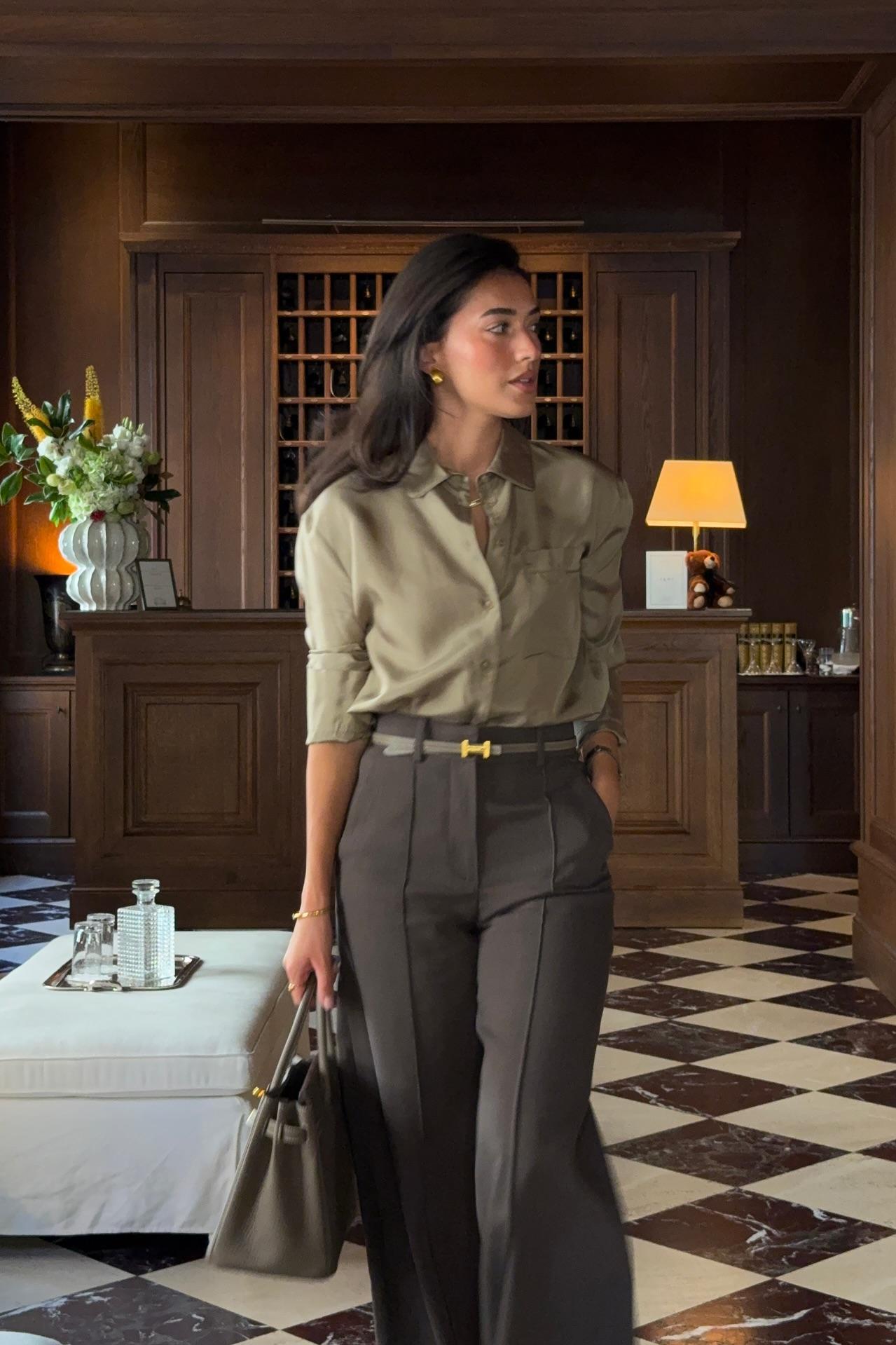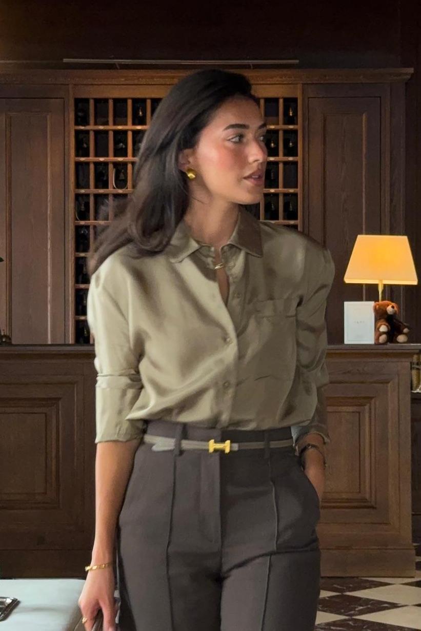 Elevate your refined wardrobe with this polished two-piece ensemble that blends timeless elegance with modern sophistication. The luxury satin button-down shirt drapes beautifully with its smooth texture. classic collar. and relaxed yet polished fit. Paired with impeccably tailored high-waisted wide-leg trousers. the set creates a lengthening silhouette that exudes effortless style. Perfect for the office. upscale gatherings. or elegant evenings out. this combination embodies luxury and confidence.